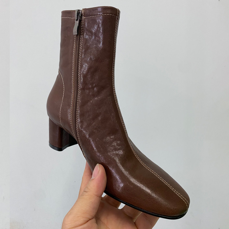 纯手工水洗牛皮粗跟短靴女葡萄家里外真皮瘦瘦靴黑色高跟真皮女鞋