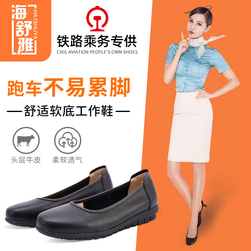 海舒雅真皮高跟鞋空姐工作鞋女感叹号黑色上班工鞋空乘平底面试鞋