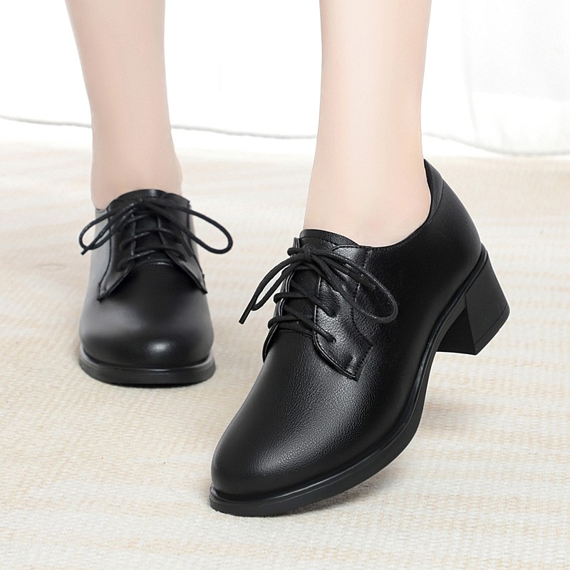 他她女孩真皮高跟系带加绒深口工作鞋女黑色工装通勤女士皮鞋单鞋