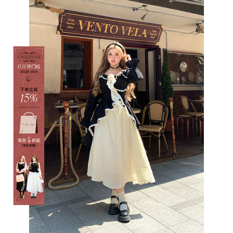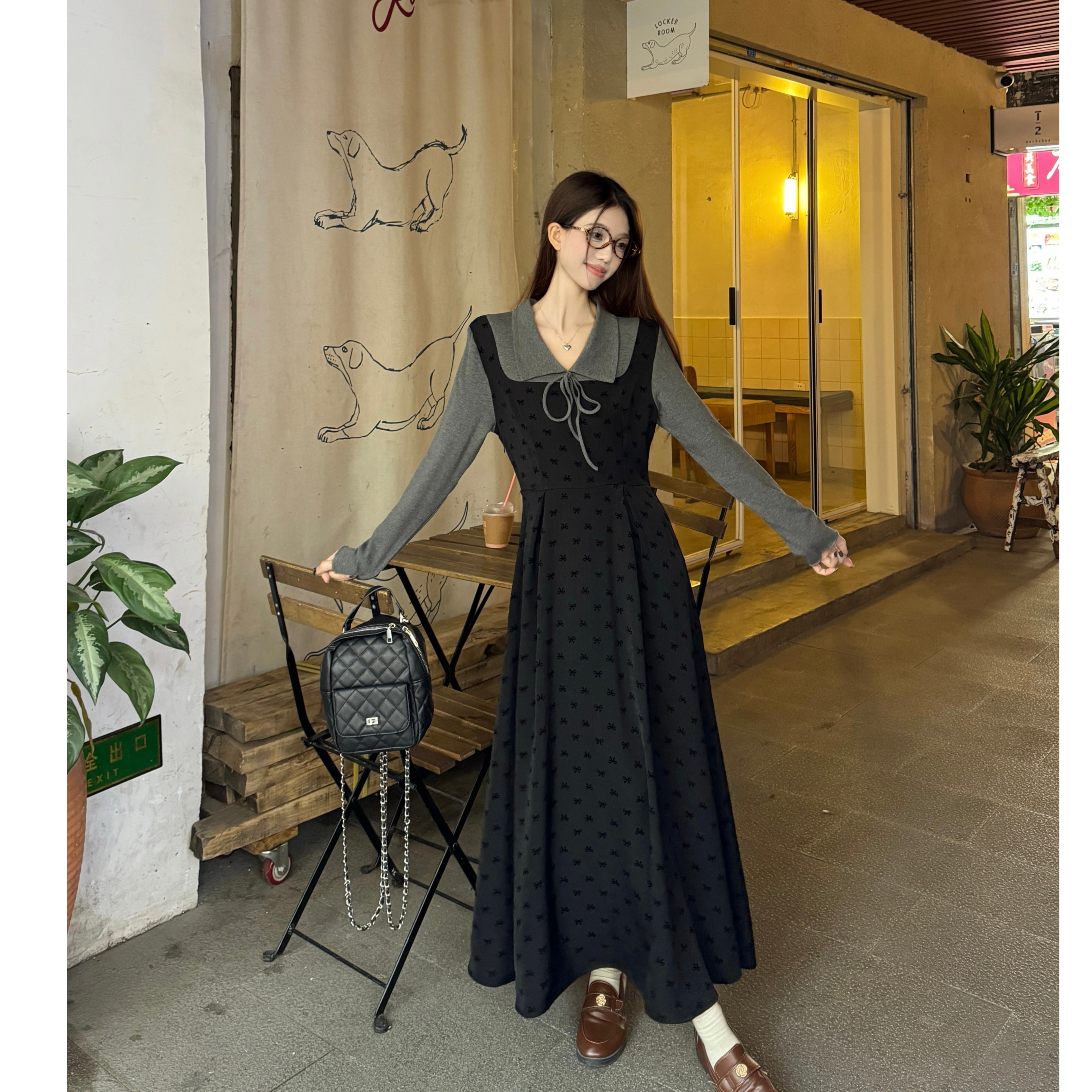 安妮不火赫本风拼接连衣裙女2025秋冬新款微胖大码小众假两件裙子