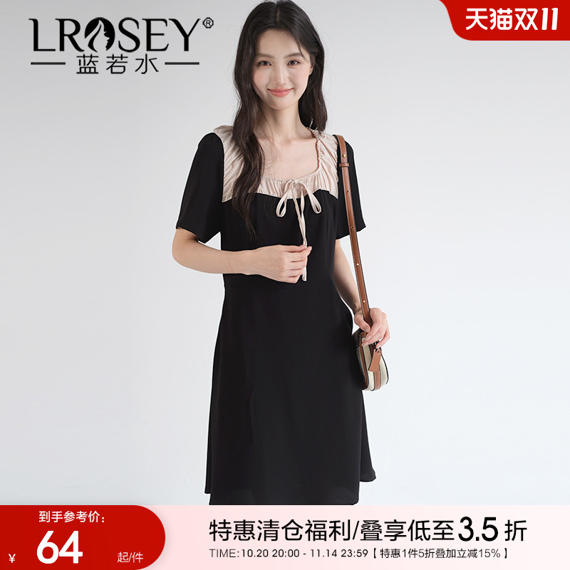 【赫本风拼色方领小黑裙】蓝若水大码2025夏装新款气质收腰连衣裙