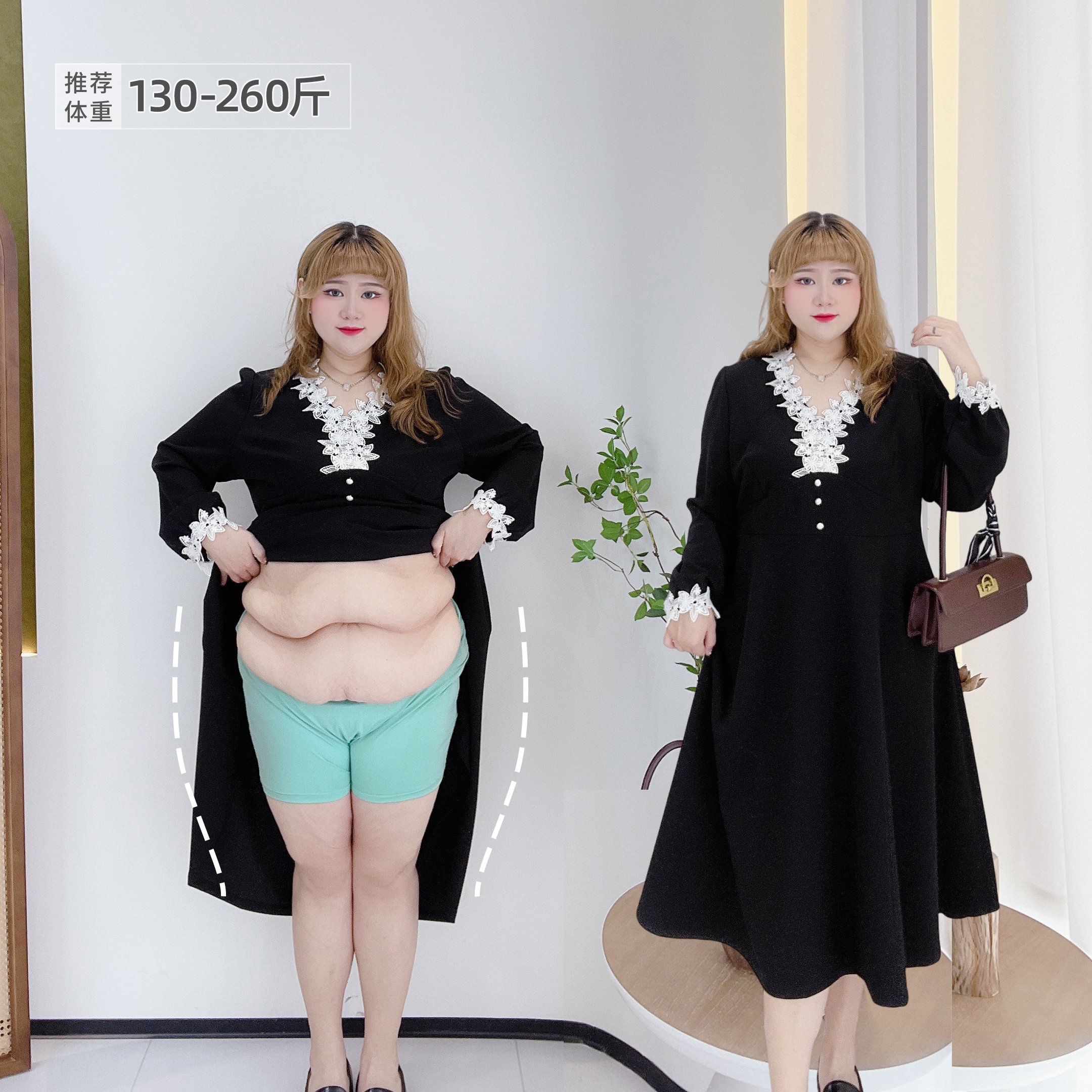 300斤胖莹大码女装黑色赫本法式复古撞色花边收腰甜美显瘦连衣裙
