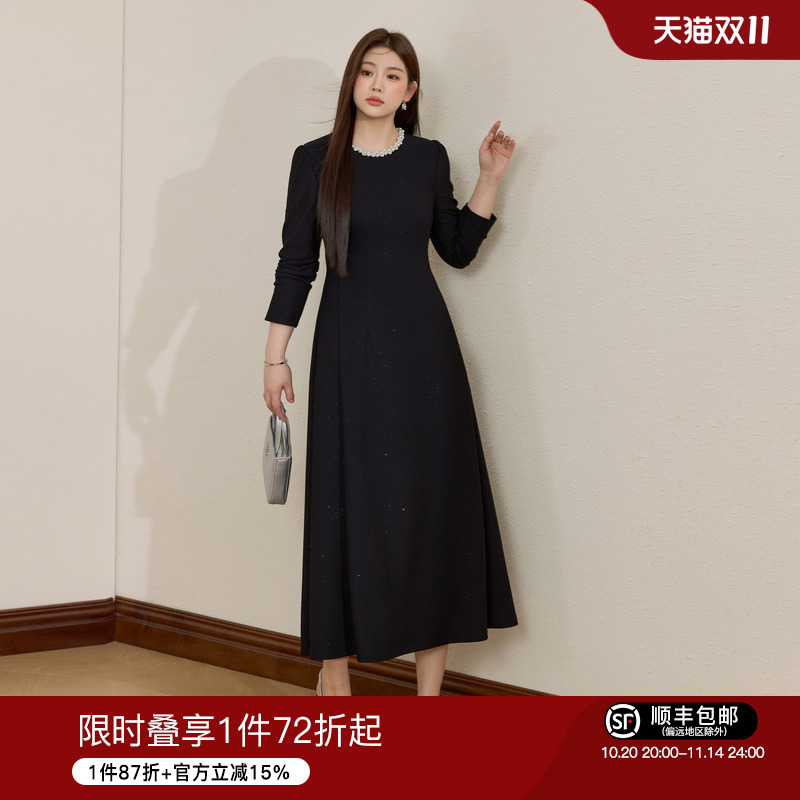 现货 蓝语黑天鹅大码女装气质赫本风显瘦连衣裙掐腰显瘦长袖a字裙