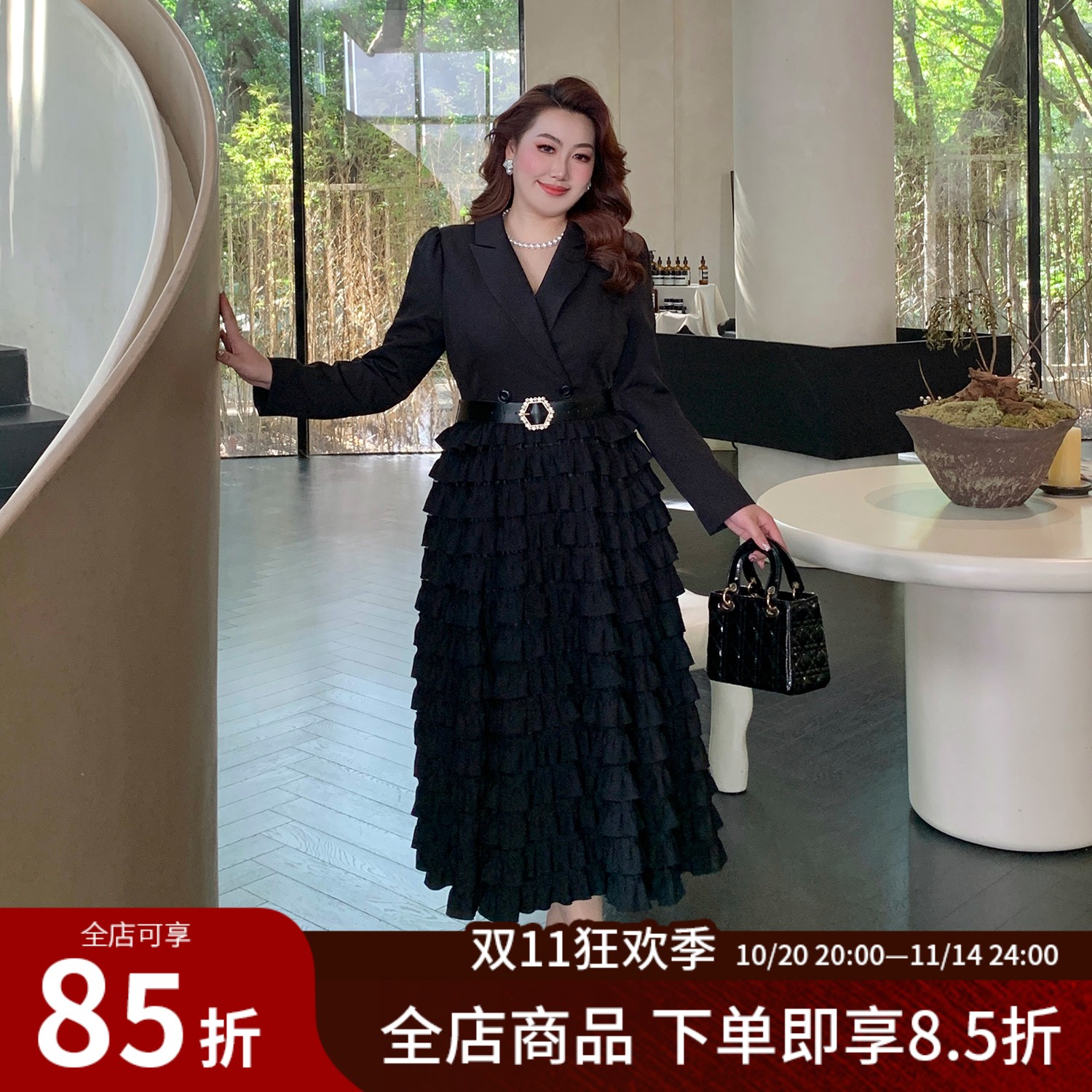 GLEC大码女装2025年秋冬新款法式赫本风复古西装领拼接蛋糕连衣裙