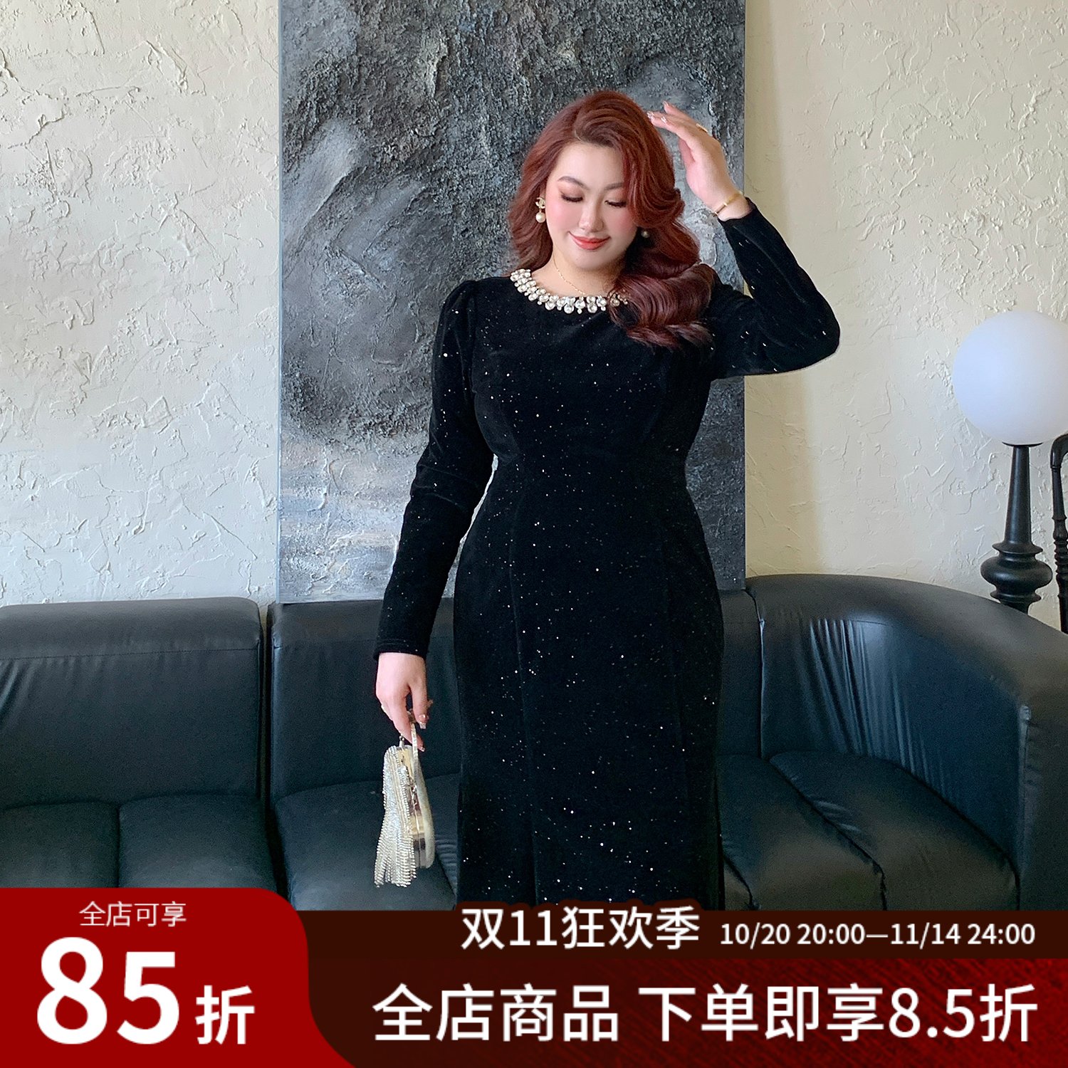 GLEC大码女装2025秋冬新款复古赫本风重工水钻时尚亮片鱼尾连衣裙