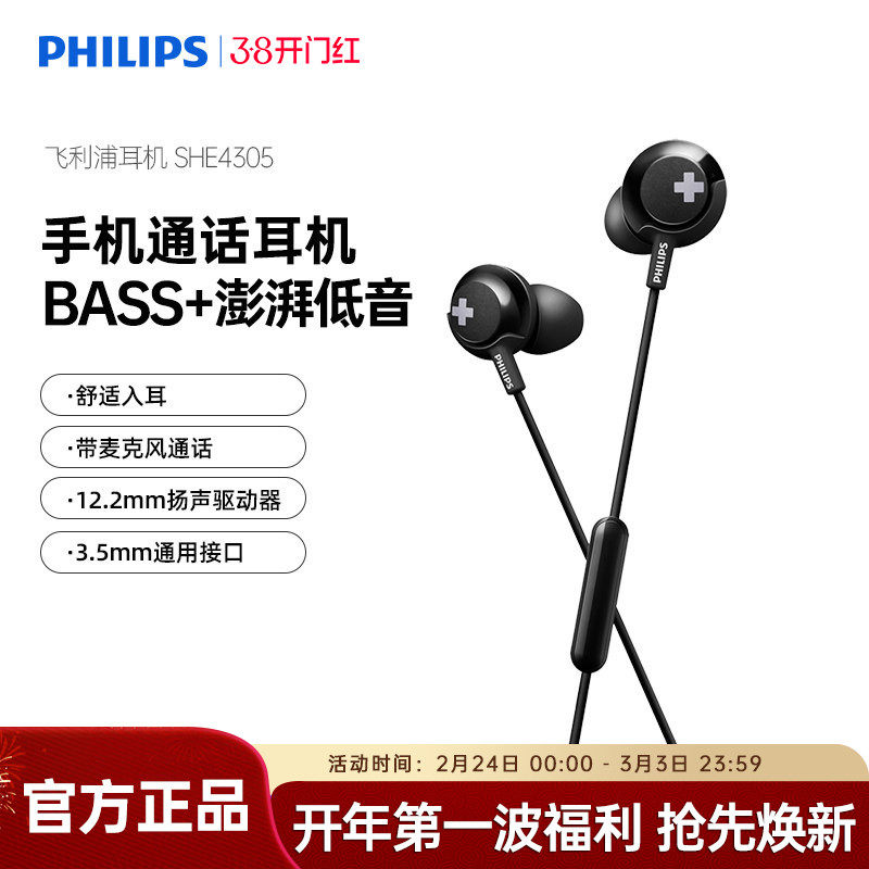 Philips/飞利浦 SHE4305双低音动圈入耳式耳机耳塞手机重低音耳麦