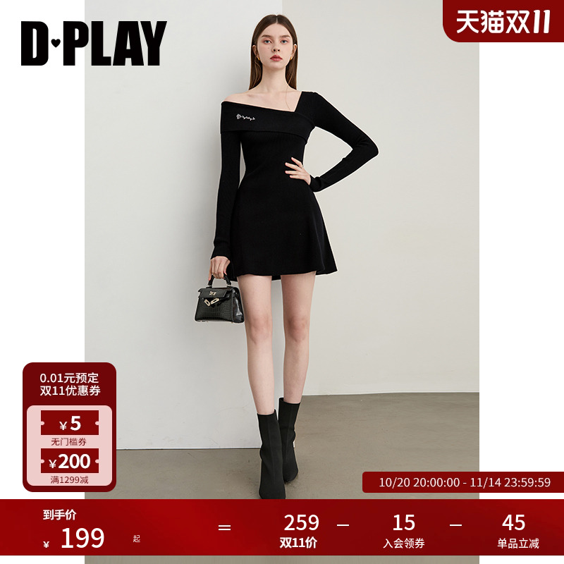 DPLAY2025年秋季新款黑色针织连衣裙女独特不对称露肩裙子小黑裙