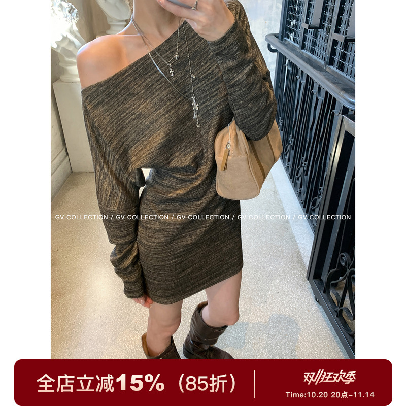 法式露肩慵懒风针织连衣裙女秋冬独特超好看显瘦收腰毛衣包臀裙子