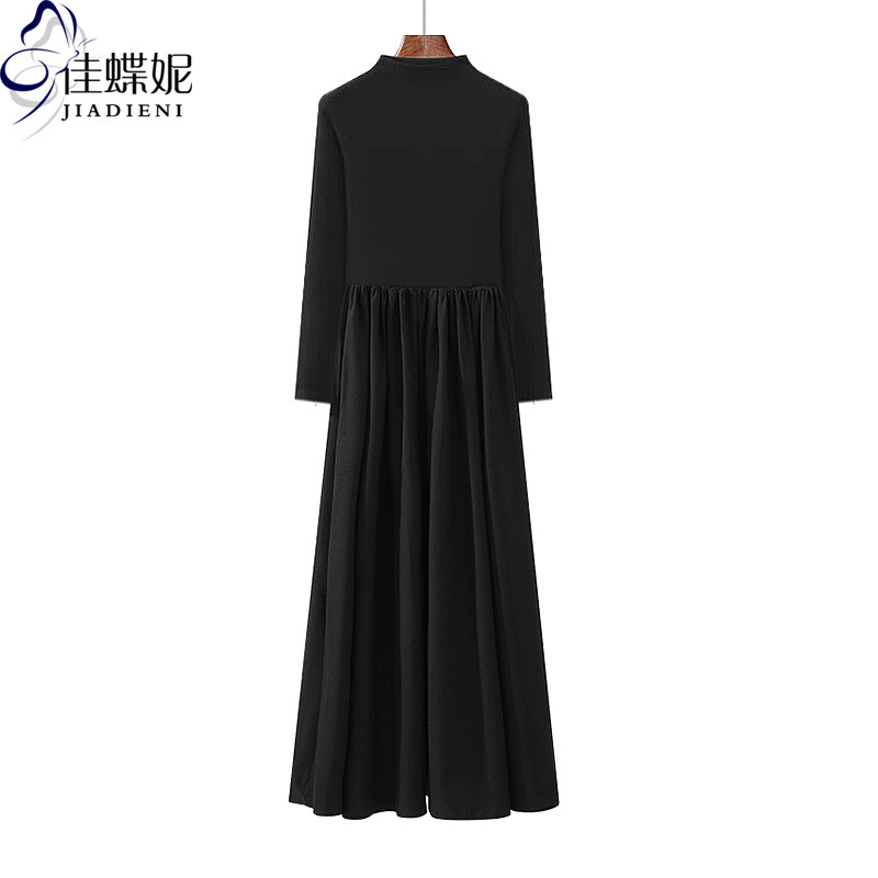 秋冬新款半高领修身显瘦拼接压褶纯色大摆长款打底长袖连衣裙女装