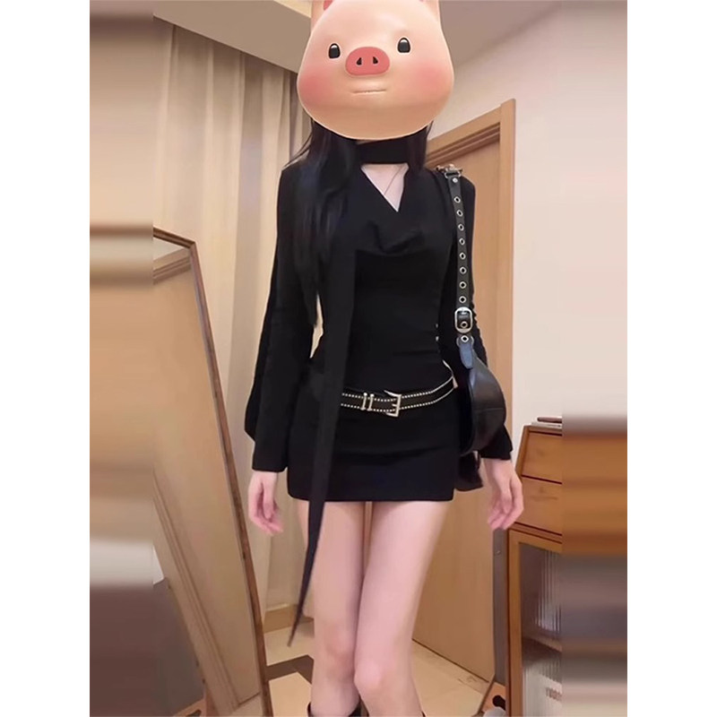 法式甜辣妹黑色长袖连衣裙女装春秋季新款纯欲度假穿搭收腰短裙子