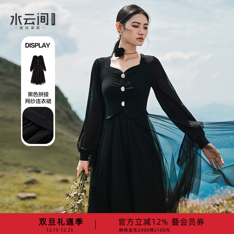 水云间黑色v领长袖连衣裙女装秋季新款2025针织拼接设计感纱裙子