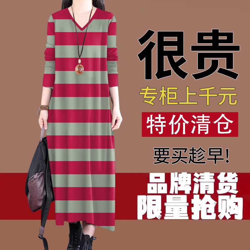 2026新款春秋季条纹长袖连衣裙女装低圆领休闲长款宽松显瘦长裙子