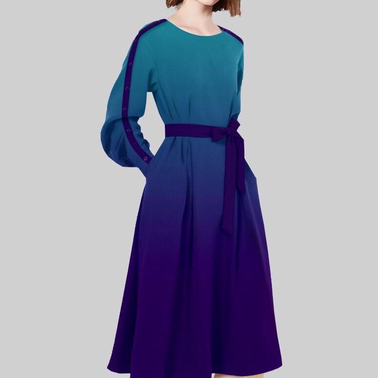 法式时尚渐变蓝长袖连衣裙女装2025年秋新款气质圆领别致系带裙子