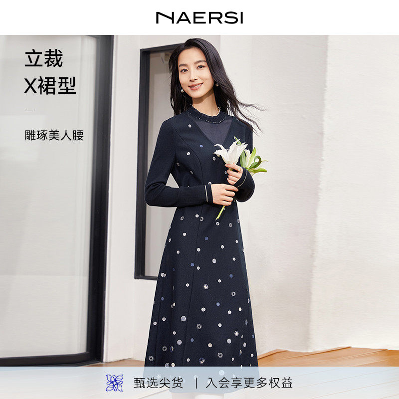 NAERSI娜尔思绵羊毛圆领长袖连衣裙女装2025冬季新款季百搭A字裙