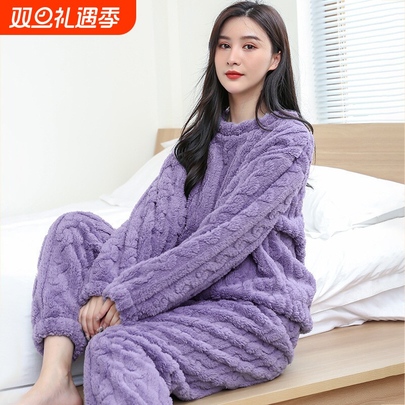 珊瑚绒提花睡衣暖暖套装女套头加厚加绒保暖可外穿休闲家居服套装