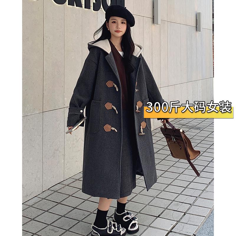 特大码女装胖mm美拉德牛角扣毛呢外套女冬季长款过膝连帽呢子大衣