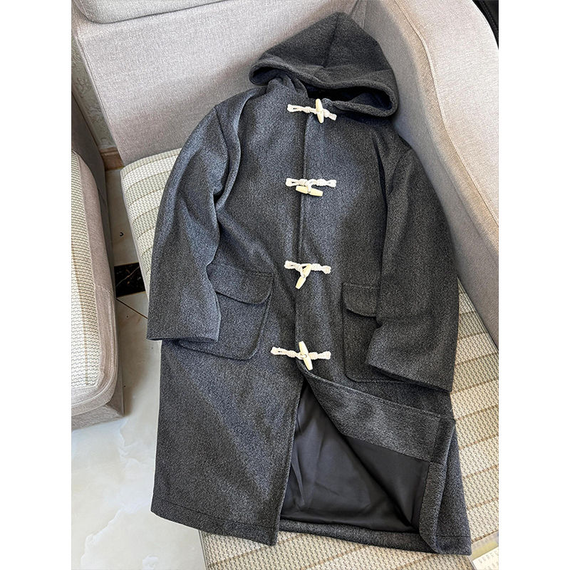 大码女装胖mm学院风连帽灰色牛角扣呢子大衣女中长款加厚毛呢外套