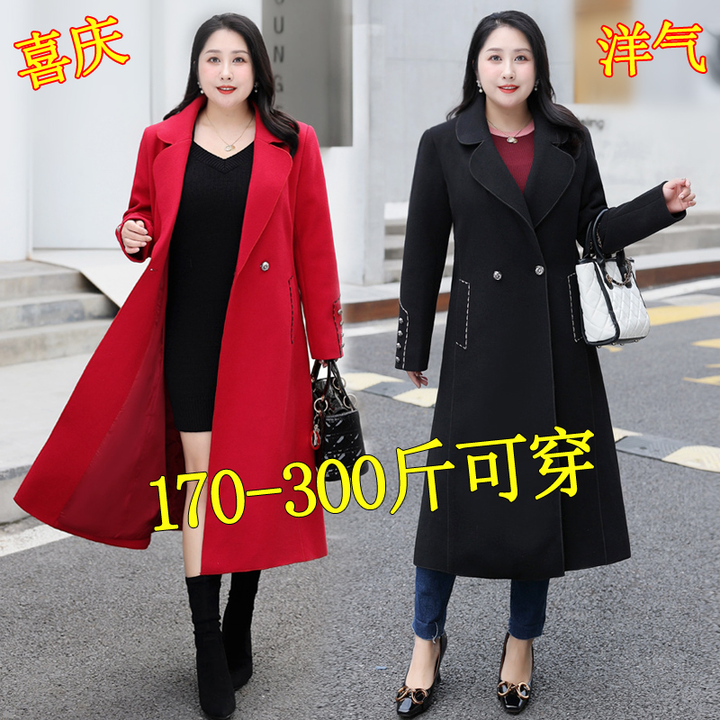 300斤特大码毛呢外套女中长款200胖mm秋冬显瘦结婚回门呢子大衣红
