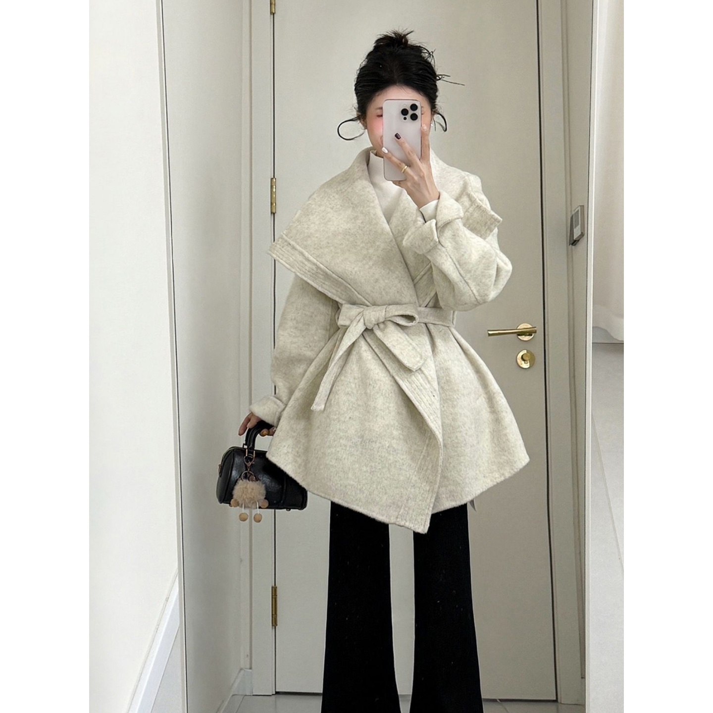 大码胖mm千金风灰色短款毛呢外套女装秋季系带收腰高级感呢子大衣