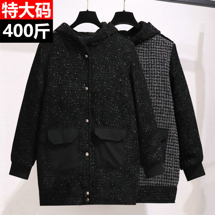 胸围180大码女装400斤可穿小香风毛呢外套女胖mm冬季连帽呢子上衣