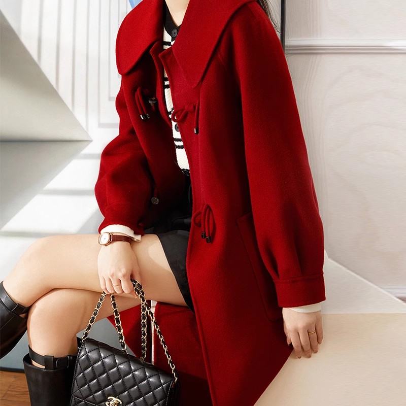 胖mm大码高级感毛呢大衣女牛角扣中长款小香风红色呢子外套200斤