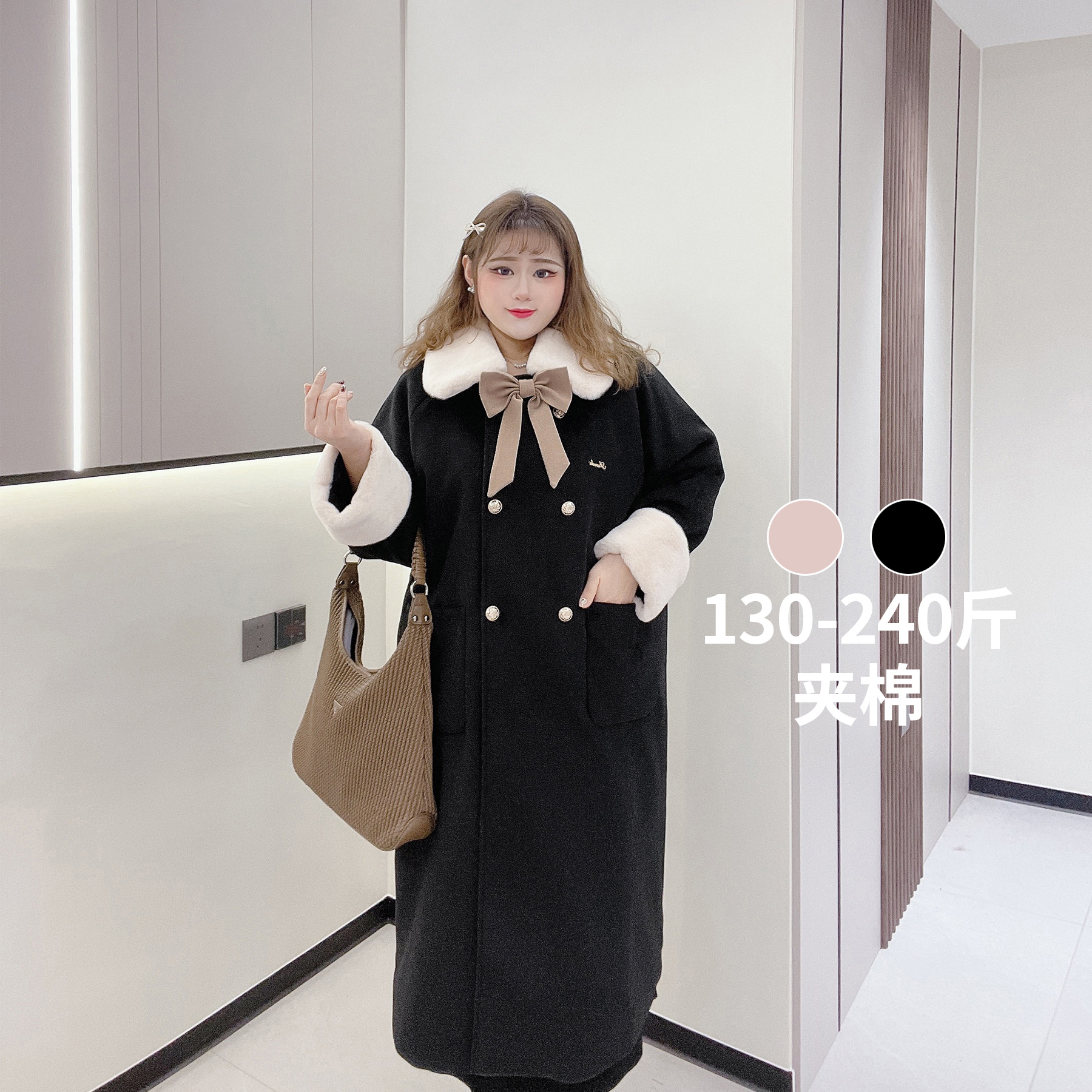夹棉呢子大衣胖仙女莹莹大码女装胖mm秋冬甜美蝴蝶结遮肉毛毛外套