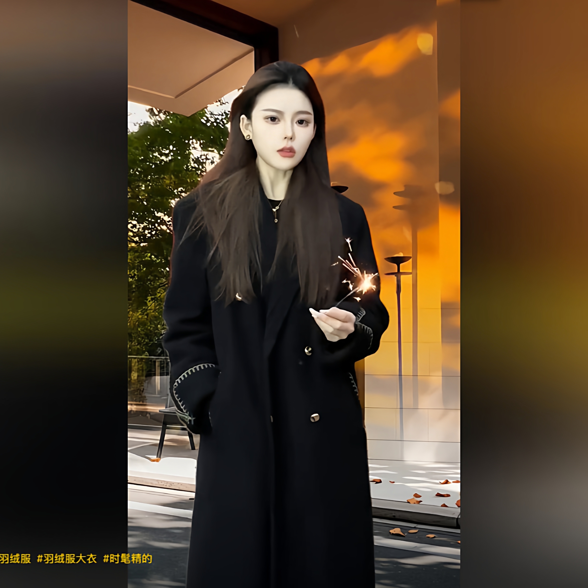高级感大码女装羊毛呢子羽绒服大衣秋冬新款胖mm过膝粗花呢长外套