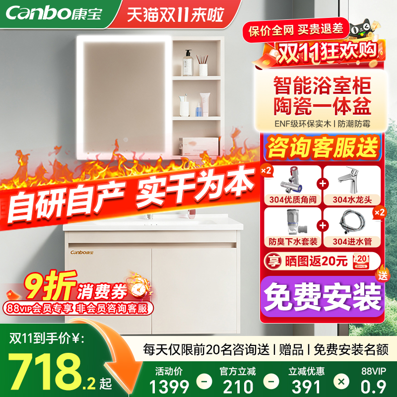 【百亿补贴】九牧环形柔光智能除雾洗手盆卫生间浴室柜组合陶瓷盆