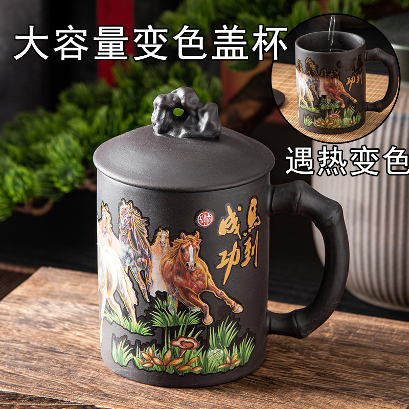 朱泥大号紫砂变色盖杯 马到成功大容量茶杯 中国风半手工办公室杯