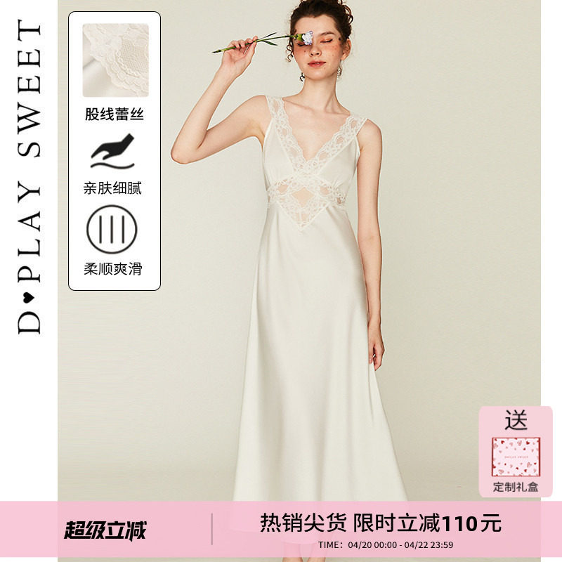 DPLAYSWEET法式白色轻奢性感镂空缎面蕾丝吊带裙长款睡裙女款新品