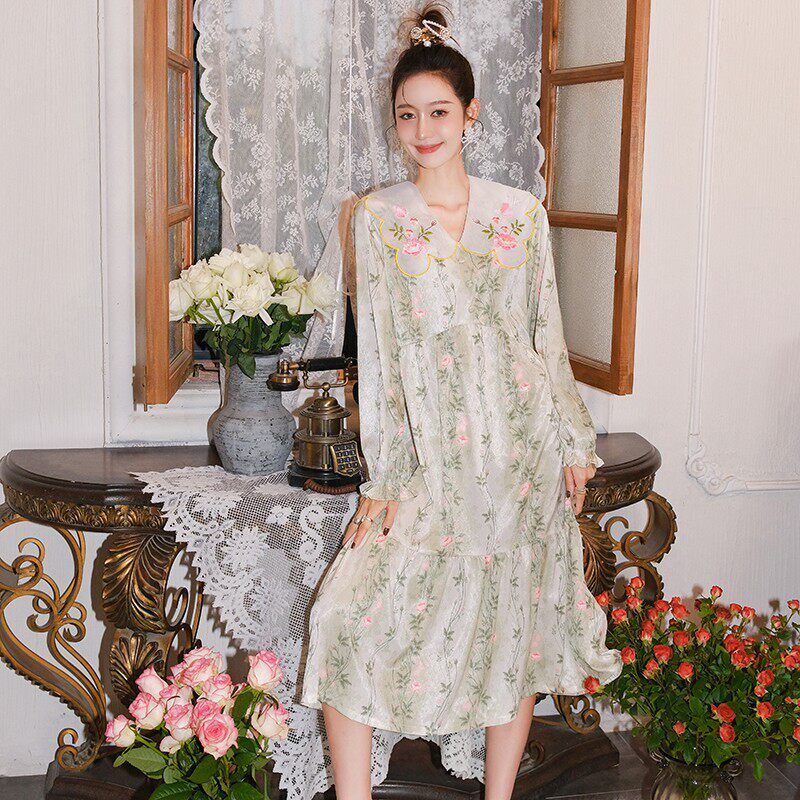 原创刺绣翻领仿真丝冰丝睡裙印花套头绸缎睡衣长袖长裙可外穿春夏