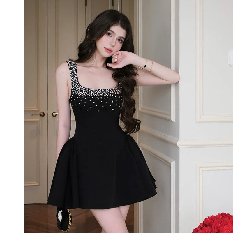 黑色吊带小晚礼服连衣裙女重工镶钻高级感宴会平时可穿生日party