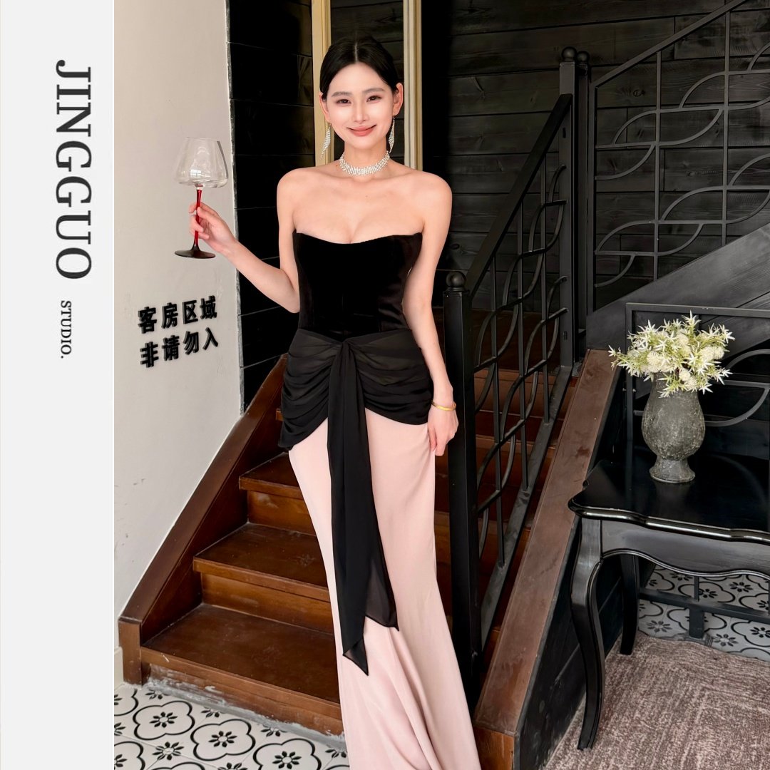 【JINGGUO轻奢】小众设计性感抹胸丝绒修身显瘦晚礼服连衣裙7620