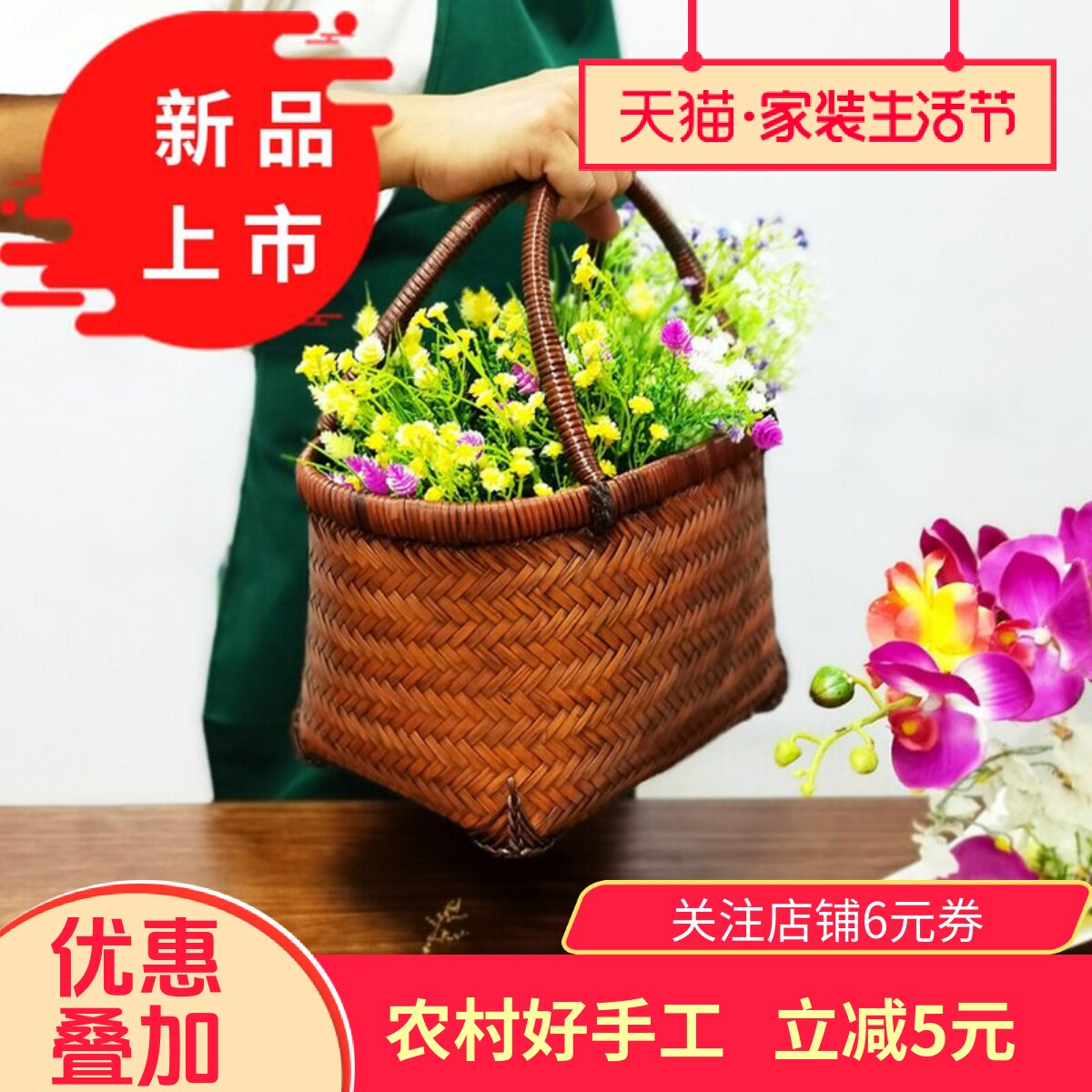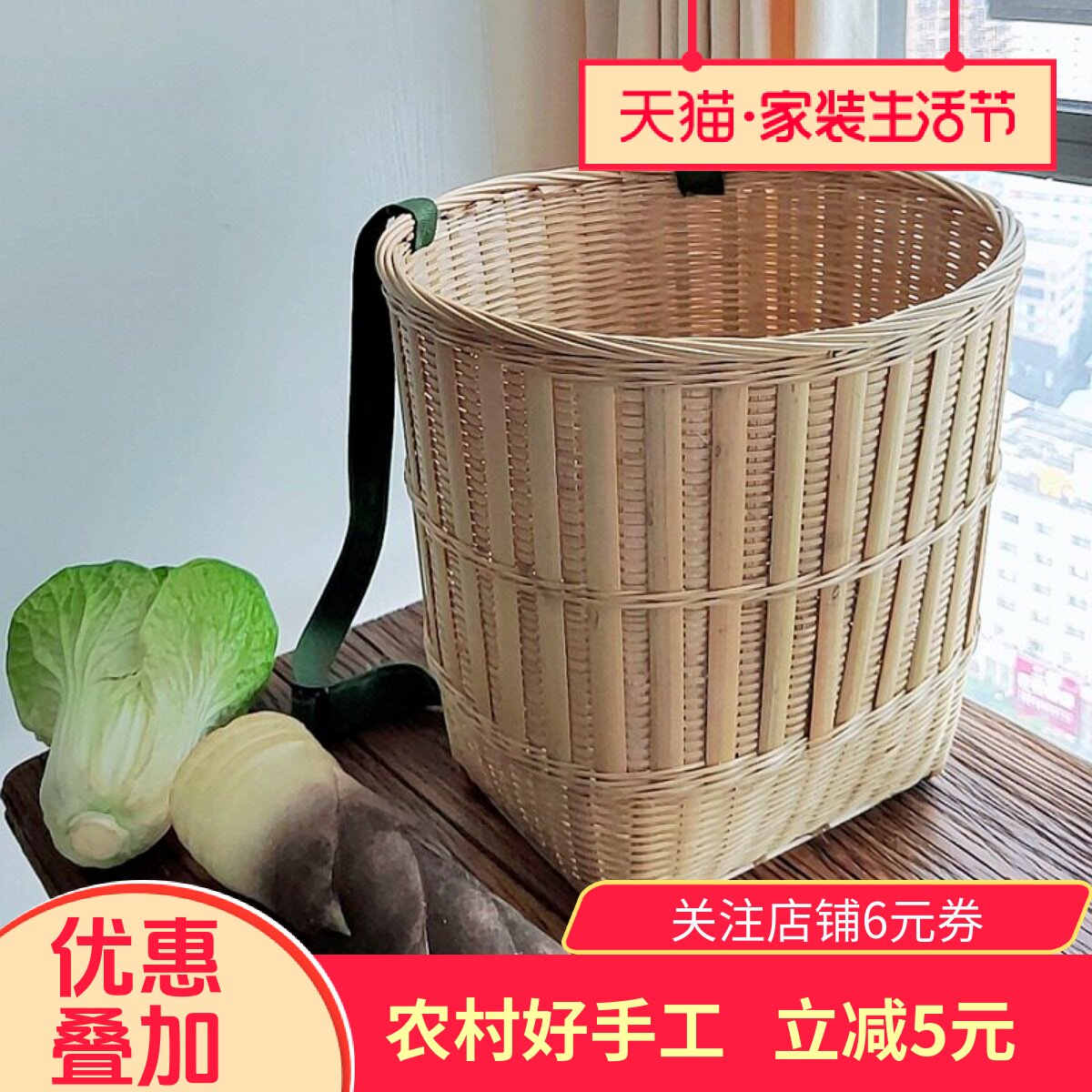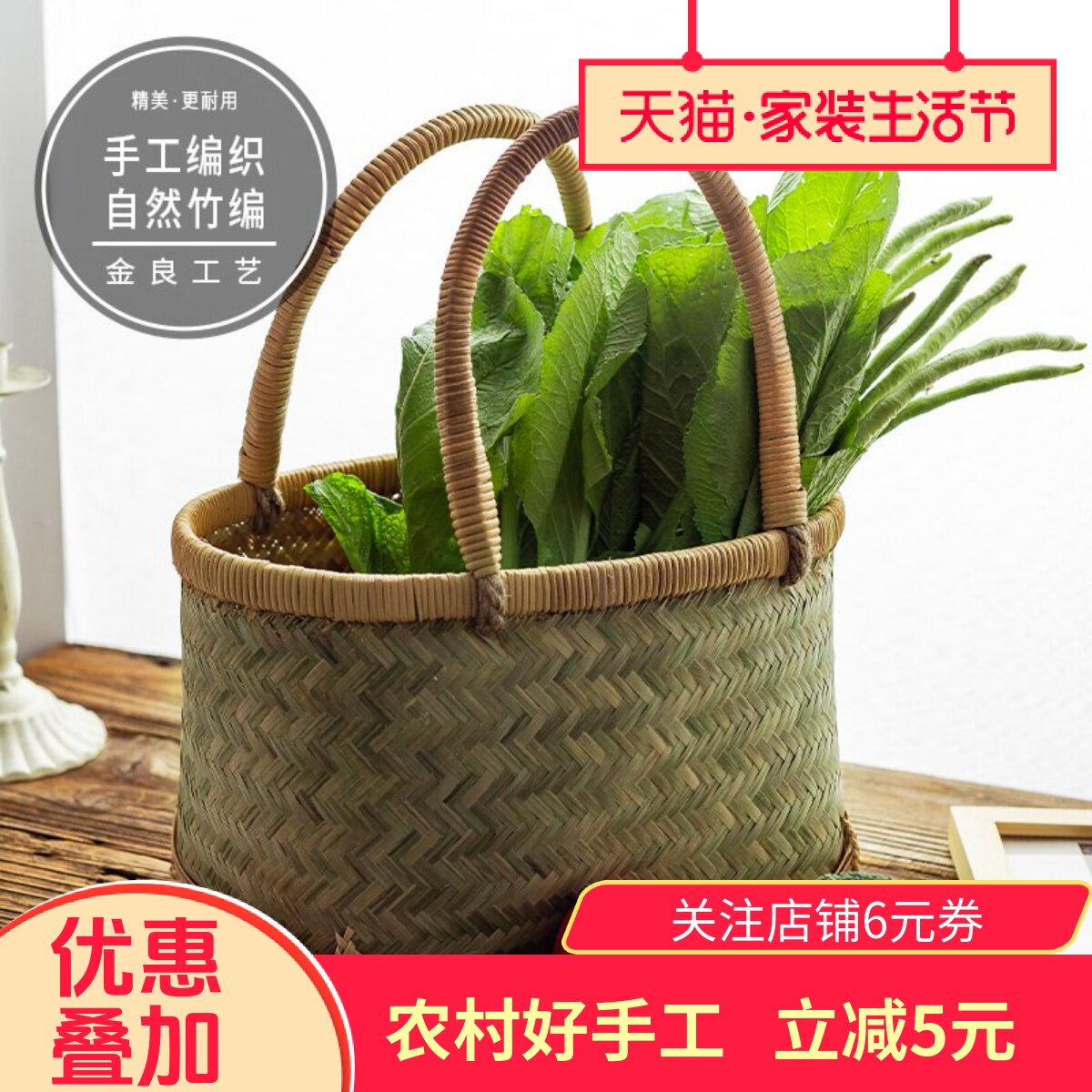 竹编买菜篮环保购物篮提手篮竹制品 手工编织采摘篮 外出竹提篮