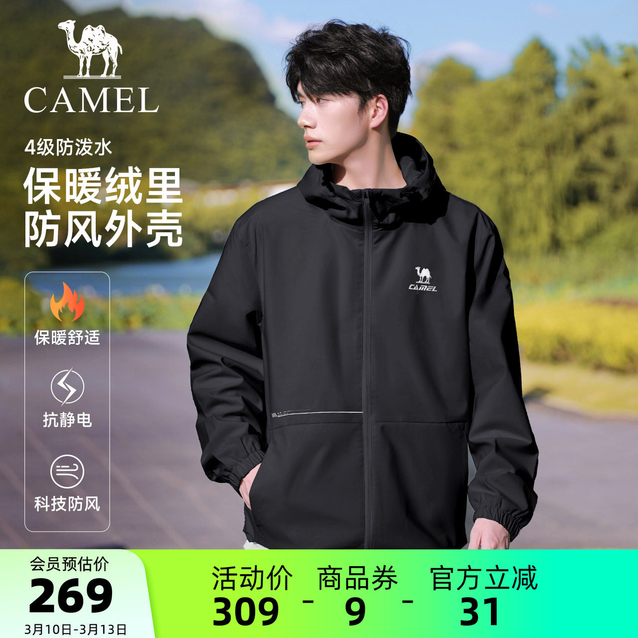 骆驼运动夹克外套男女款春夏季拉链连帽防风薄绒户外防泼水登山服