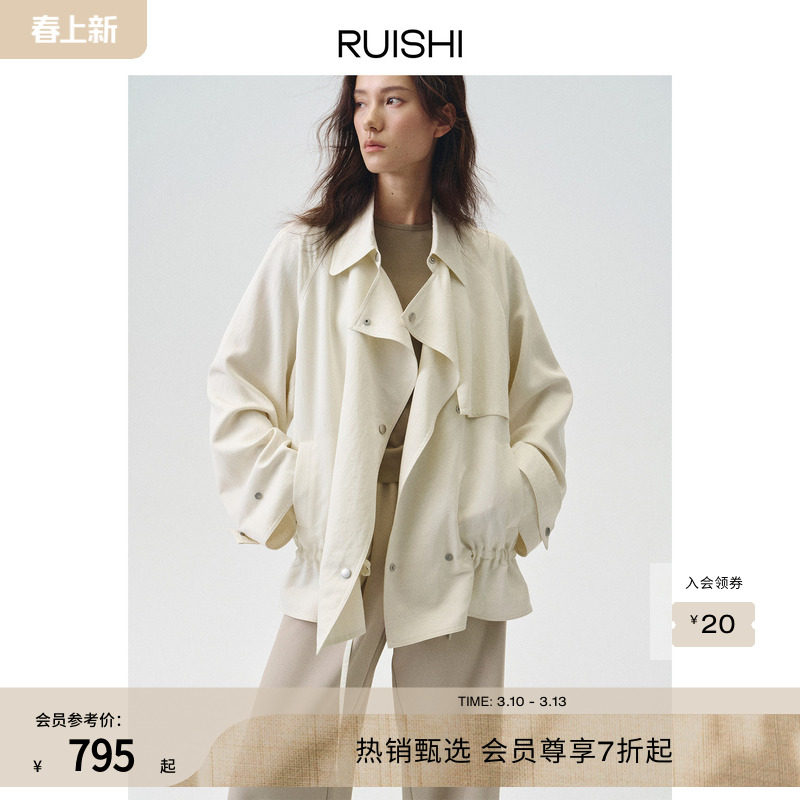 RUISHI芮时“巴黎画廊”莱赛尔翻领低腰抽绳垂坠短风衣外套女春夏