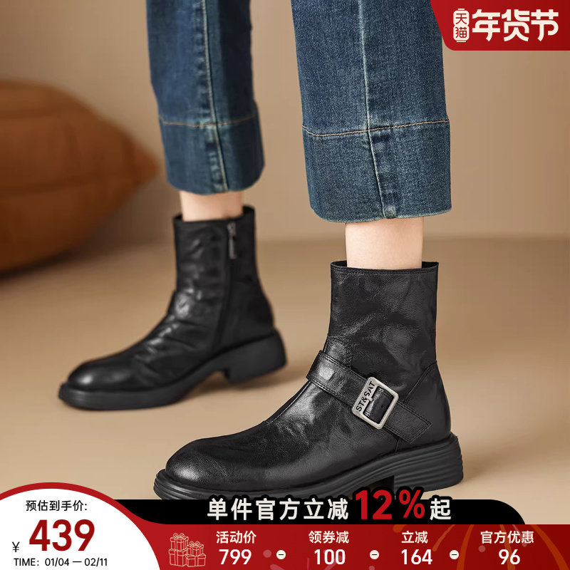 星期六2025新款英伦风皮带扣短靴女粗跟百搭机车靴厚底保暖马丁靴