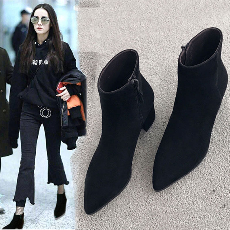 法式绒面短靴女粗跟方头后拉链百搭瘦瘦靴显瘦加绒短筒靴子小踝靴