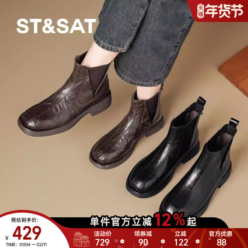 星期六2025新款黑色绒面短靴女粗跟厚底舒适瘦瘦靴秋冬保暖时装靴