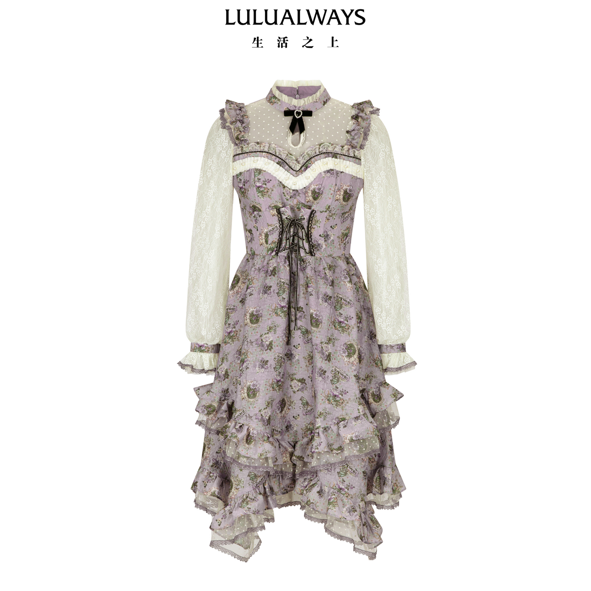 LULUALWAYS我爱露露26春季新款法式浪漫提花不规则蕾丝长袖连衣裙