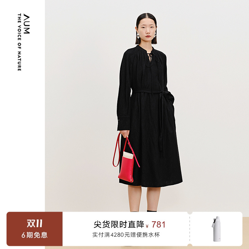 【天猫臻选】AUM噢姆2025年春季新款羊毛提花蕾丝长袖黑色连衣裙