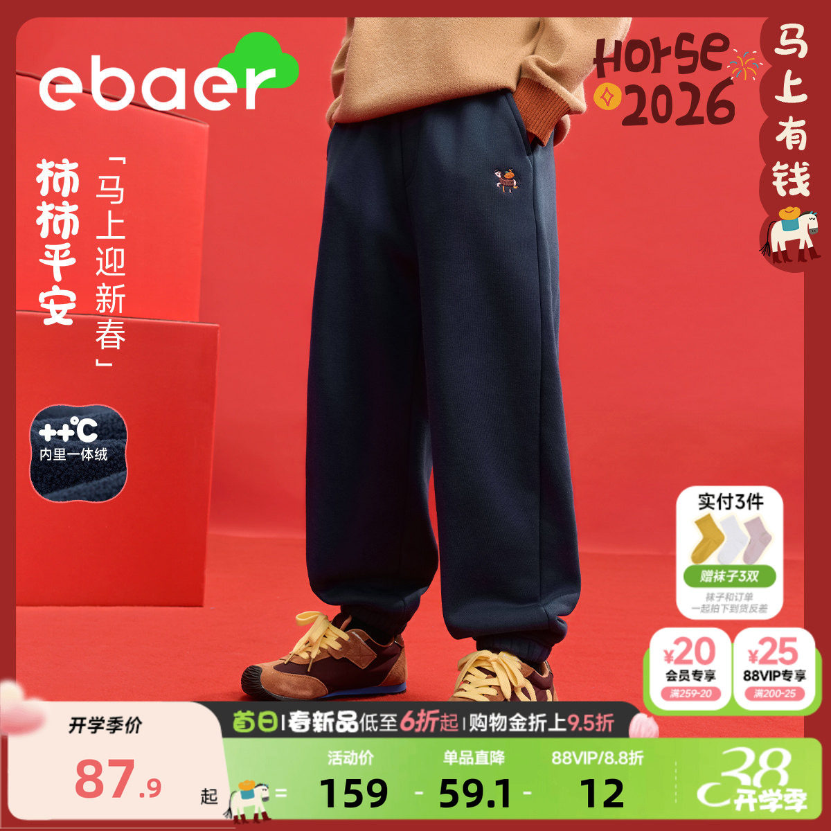 EBAER男童加绒裤子2026马年运动裤新年儿童拜年裤加厚长裤女童