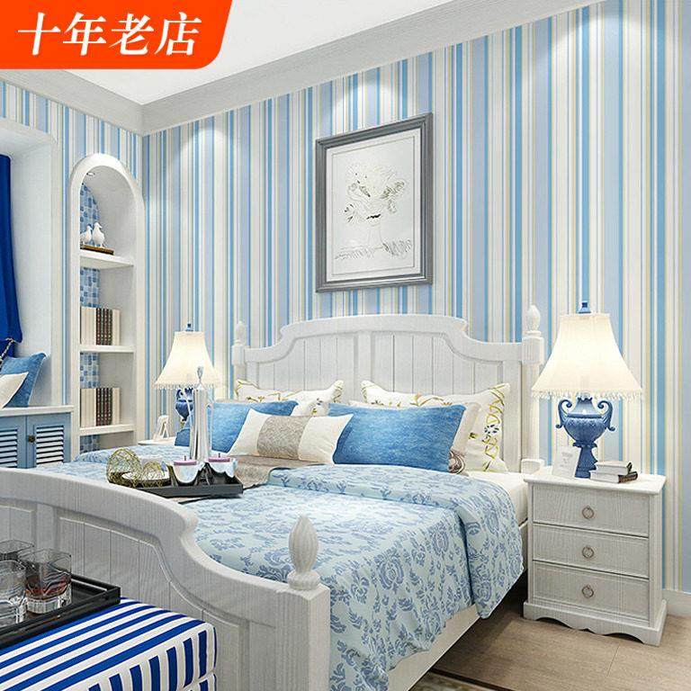 儿童房壁纸男孩卧室背景墙蓝色地中海风格壁纸现代简约蓝白竖条纹