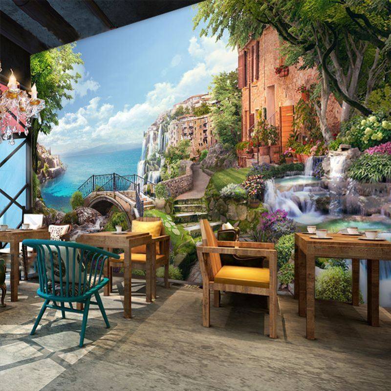 欧洲小镇壁纸地中海风格墙布街景花园风景外景延伸壁画奶茶店墙纸