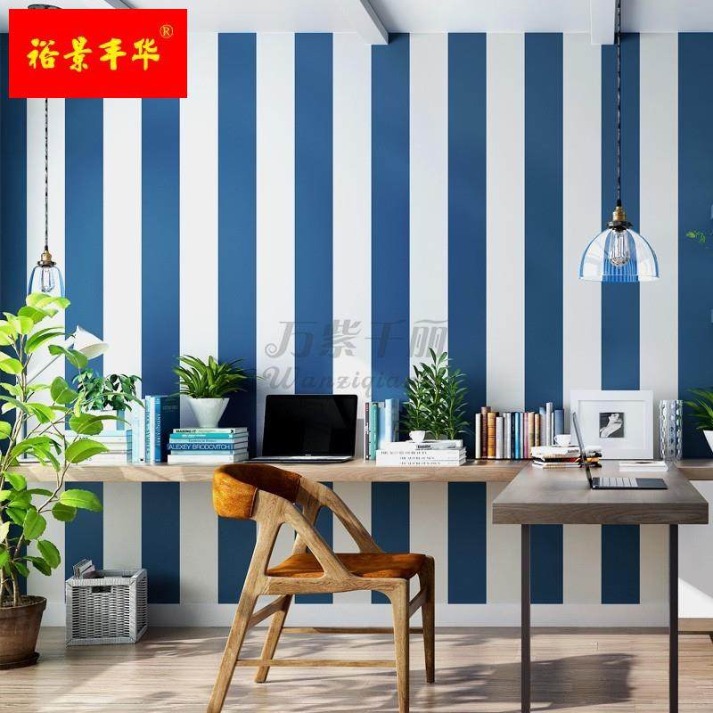 儿童房壁纸男孩卧室背景墙蓝色地中海风格墙纸现代简约蓝白竖条纹