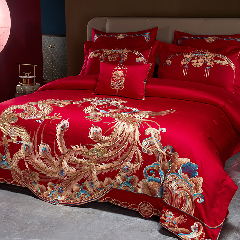 新中式婚庆床品60支长绒棉大红色双喜刺绣结婚被套床单四件套纯棉