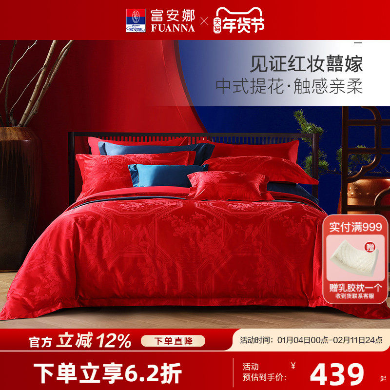 富安娜纯棉提花大红婚庆套件红色结婚床上用品新婚全棉床单四件套