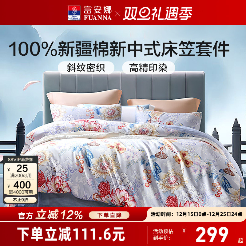 富安娜60支长绒棉纯棉床单四件套刺绣床品被套简约全棉床上用品
