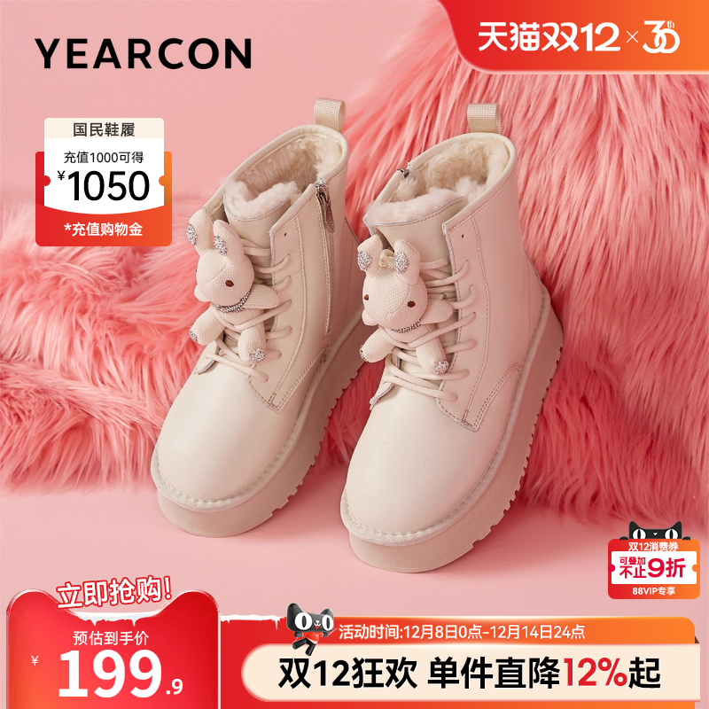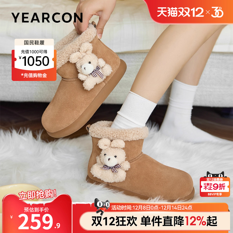 意尔康女鞋2025冬季加绒保暖棉鞋厚底短筒可爱雪地靴户外休闲短靴
