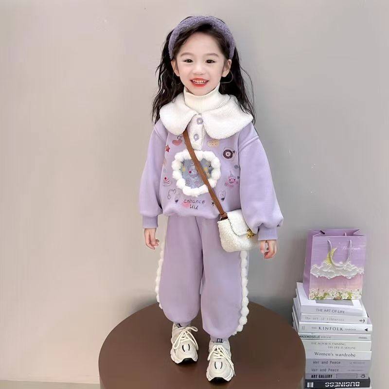 女童一体加绒卫衣卫裤套装25新款冬装宝宝保暖卡通上衣长裤两件套